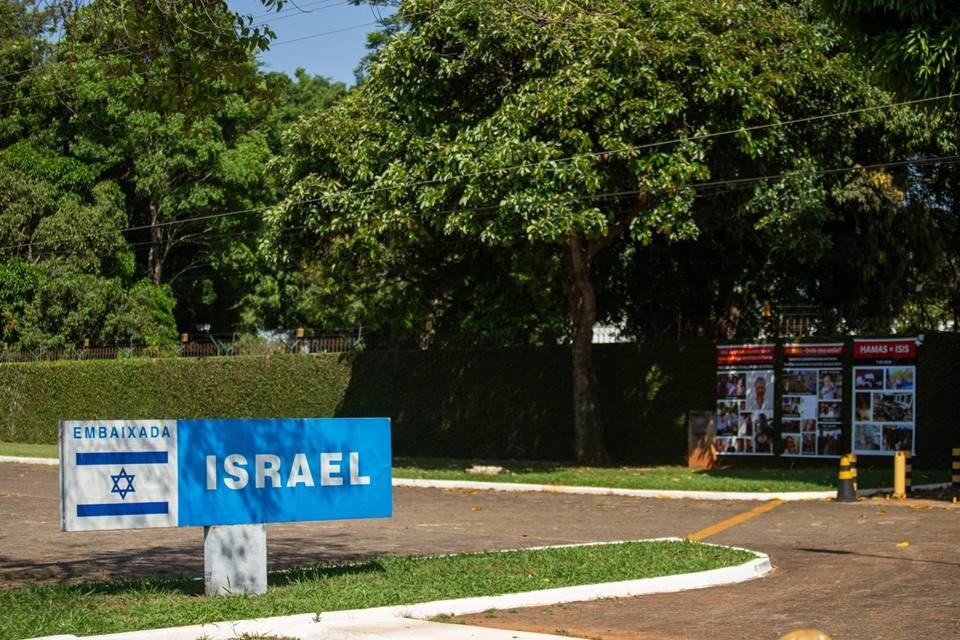 Banner em frente à Embaixada de Israel tem protesto contra o Hamas